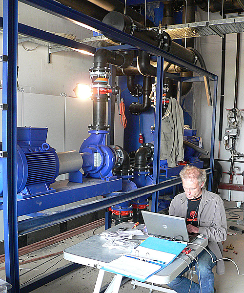 Men at Work: Programmierung der SPS Steuerung vor Ort. Im Hintergrund die Pumpenstation mit einer der filigranen Hauptpumpen